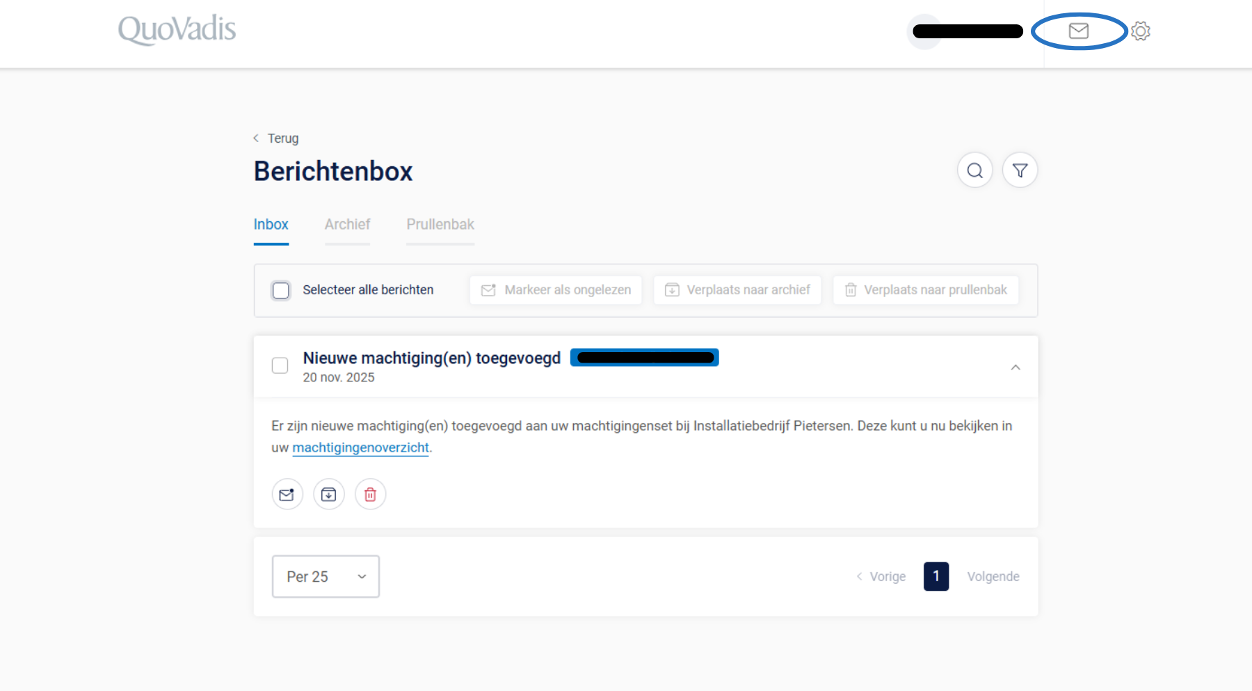 Zodra u inlogt op de beheerapplicatie in Mijn QV ziet u rechtsbovenin een envelop-icoontje. Wanneer u hierop klikt, komt u direct in de berichtenbox.