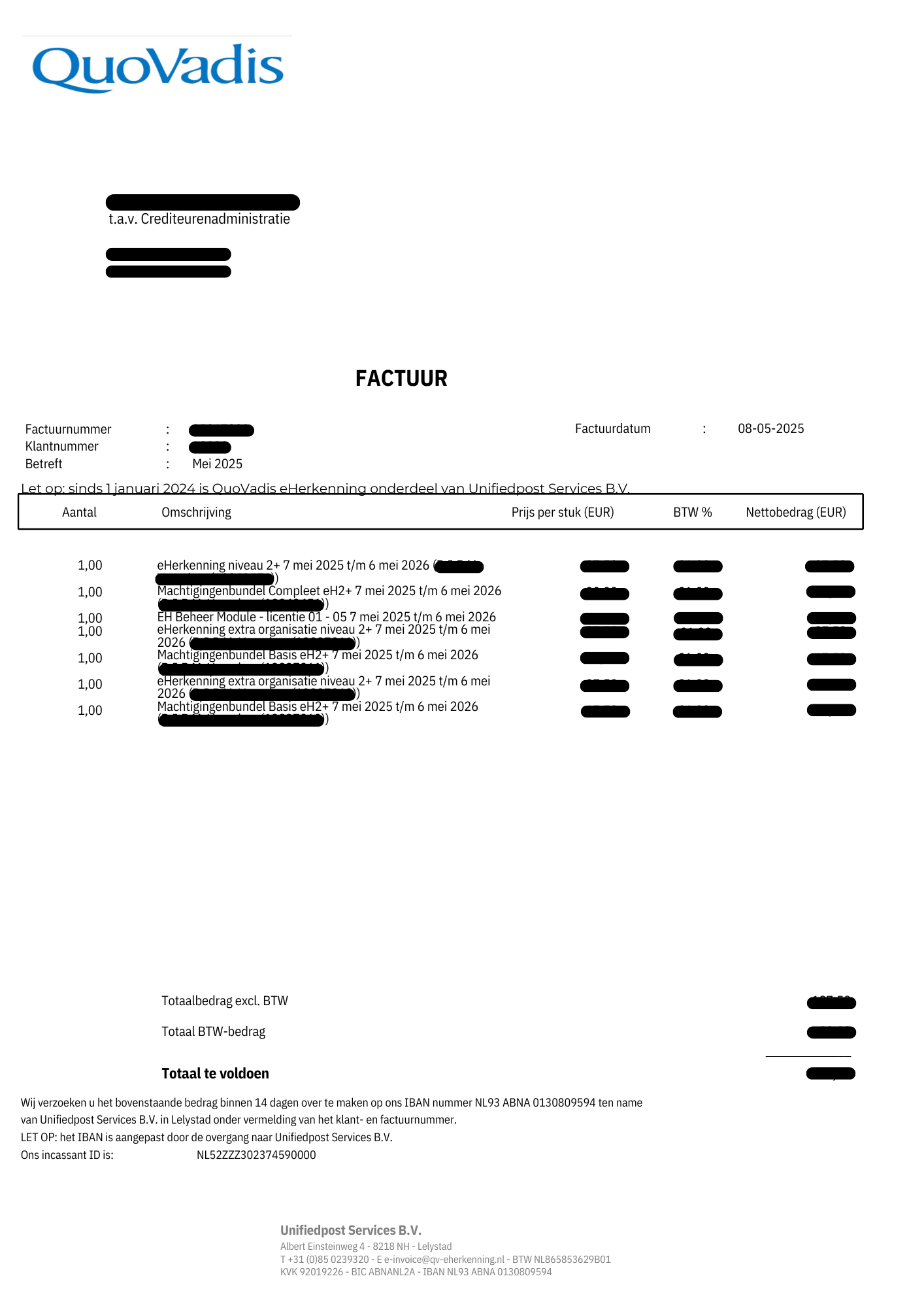 Per 1 januari 2026 is QuoVadis overgestapt op een nieuw facturatiesysteem. Dit maakt de facturen overzichtelijker en hierdoor kunnen wij u nog beter van dienst zijn bij vragen over uw abonnement(en) en/of facturen.