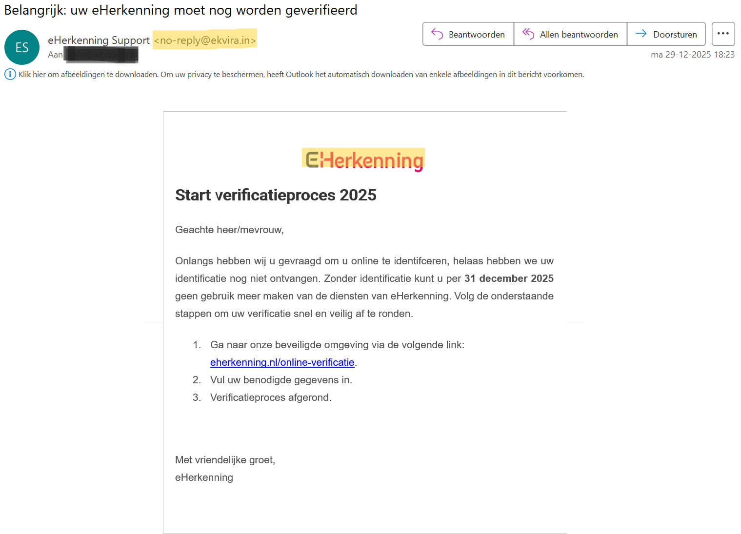 Links in nepmails kunnen ervoor zorgen dat er schadelijke software op uw computer wordt geïnstalleerd of leiden u naar valse websites. Klik dus nooit zomaar op de links en een e-mail die u niet vertrouwt. - Wij communiceren NIET uit naam van eHerkkenning